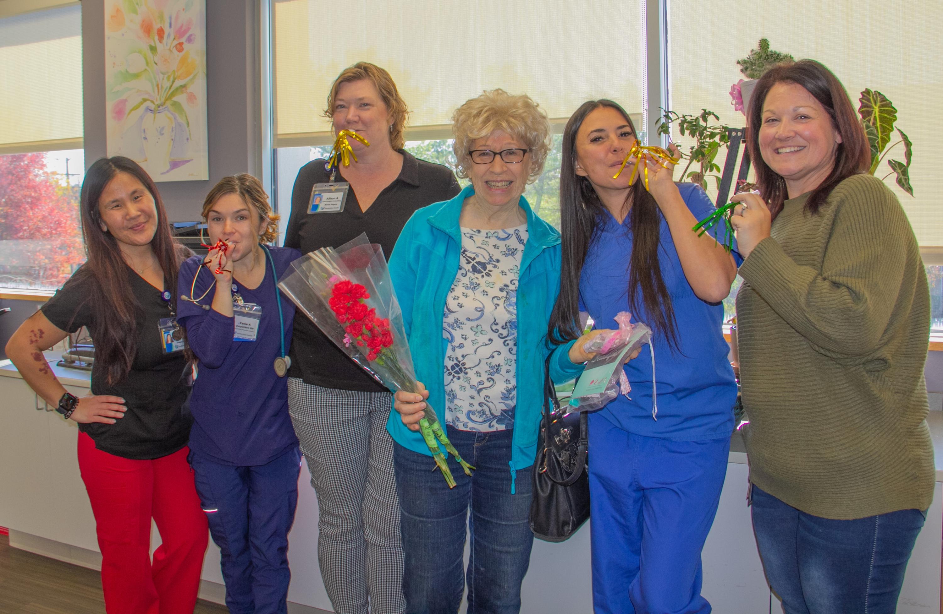 Kathryn Menscher recently received a new title at her last appointment: cancer survivor. She has officially graduated after being followed for five years by Jennifer Montes, MD, MPH, Breast Surgeon. Dr. Montes explained that all patients are followed for five years after treatment. At their five-year appointment, each patient is celebrated with staff cheering, party horns blowing, a graduation pink tassel, and a goodie bag. Patients who agree also have their photos taken for the graduation board.